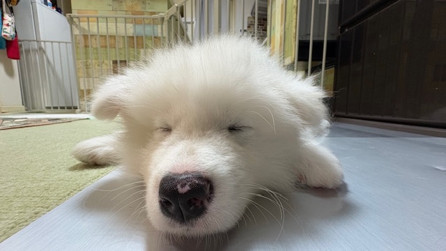 何も考えてない、ただ爆睡中の子犬。見ているだけで癒される。トラジです。